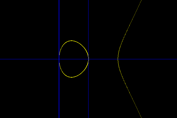 2 dy/dx = 3x2+a or dy/dx = (3x2+a)/2yWhen y0=y1 or x0=x1 and y0=0, then the new value (x2,y2) is written as (1,0). The chord tangent process defines an operation on a pair of points P=(x0,y0) and Q=(x1,y1) written P+Q. 2.P is P+P and 3.P is 2.P+P or P+2.P and so on. It can be shown, with some difficulty, that the set of points P=(x,y) along with (1,0) along with the operation '+' satisfy the axioms of an Abelian Group. The point 0=(1,0) is the zero in the group and -P = (x,-y) where P = (x,y). The difficulty arises in proving associative law (P+Q)+R = P+(Q+R) for three pairs of points, P,Q, and R. Silverman suggests using a computer algebra package to show that a repeated chord tangent process generates a symetric formula in six variables x1,x2,x3,y1,y2,y3. There is some merit in this approach.