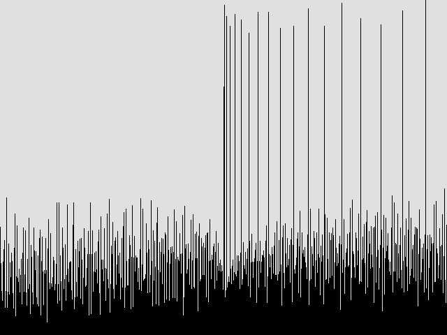 The vertical bars to the right correspond to values x = n2 or the square numbers. They express the fact that t2=s3+as+n2 always has a point (n,0), whatever the value of a. The slanting lines satisfy the equations sy+x = t2-s3 and sy-x = t2-s3, or y= +- x/k + (t2-k3)/k. When k>1 the pixels on the sloping line become rather spread out, compared to points that would be placed using a computer line drawing algorithm. Areas of black correspond to elliptic curves where there are no integer solutions for the checked range. A frequency count for vertical lines shows sharp spikes at the points x=n2.